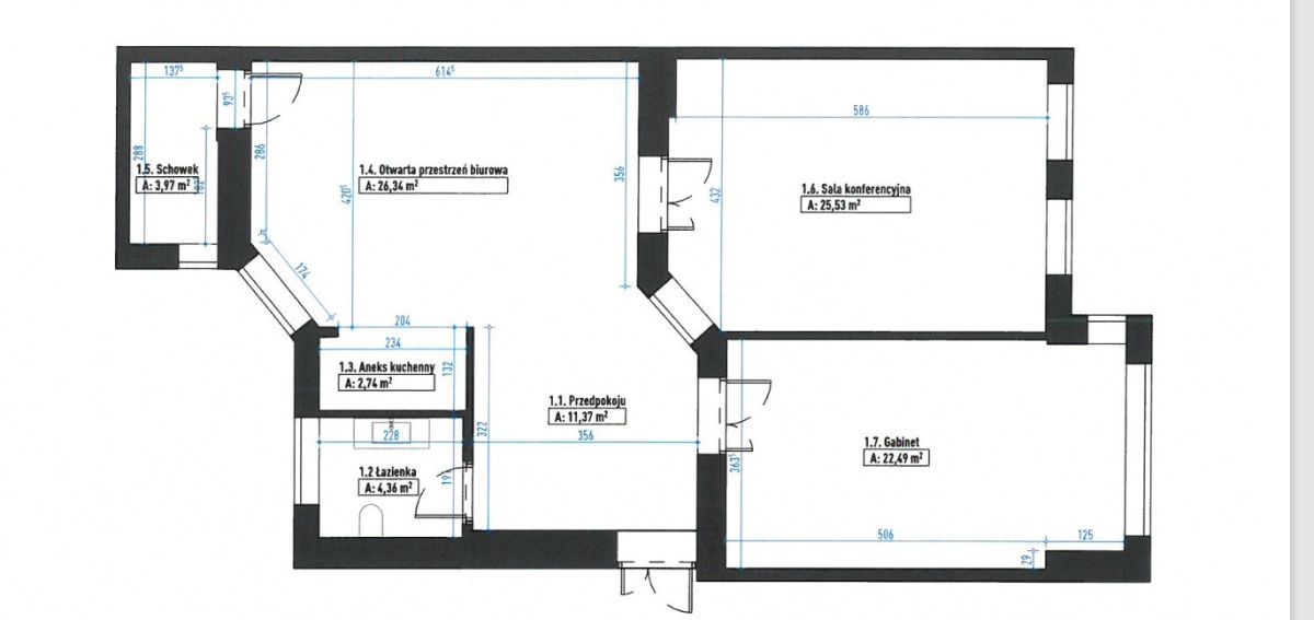 - trzy pokoje biurowe: 25 m² - 27 m²,