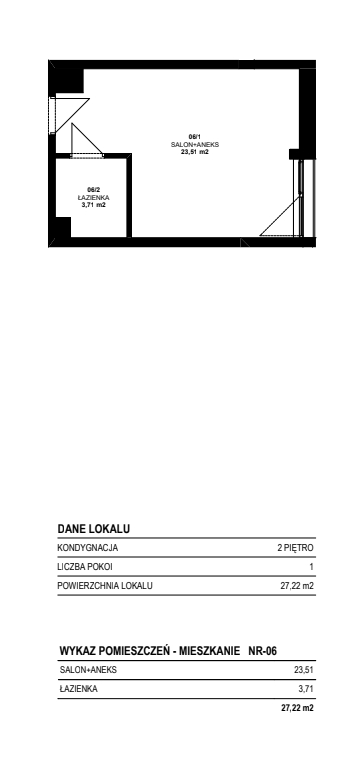 Lokal o powierzchni 27,22 m² został zaprojektowany w sposób przemyślany i funkcjonalny. Składa się z dużego, jasnego pokoju dziennego, który może pełnić jednocześnie funkcję strefy wypoczynkowej oraz sypialnianej, a także z łazienki. Duże okna zapewniają bardzo dobre doświetlenie wnętrza, co sprawia, że mieszkanie jest jasne i komfortowe w codziennym użytkowaniu, mimo kompaktowego metrażu.